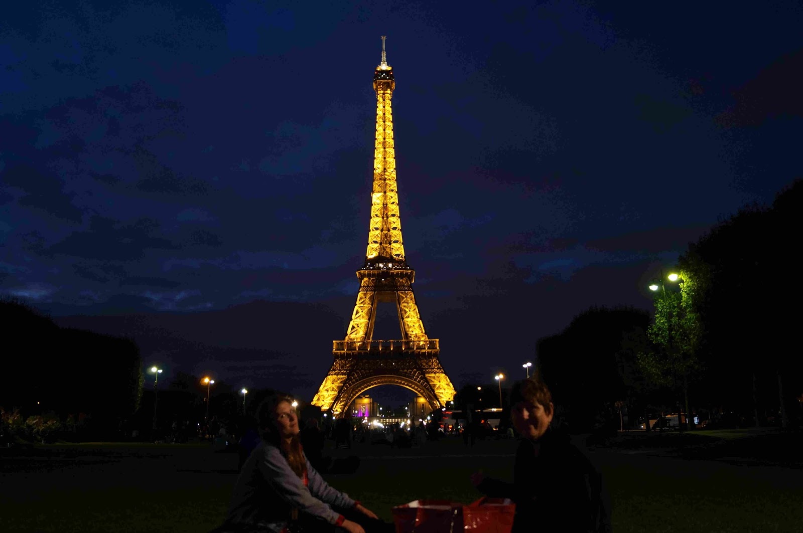 The sun was beginning to set, the shadows were lengthening and the article lights were beginning to kick in when we jumped on the Metro at the Opera and journeyed out to the Champ de Mars-Tour Eiffel station. We spied the Eiffel Tower as soon as we emerged from the station. Already lit up as darkness was rapidly descending. It was a warmish, still night with clear skies. Many people were out and about as it was Parisian dinner time. We ducked into a a little grocery store or some wine, Perrier, cheese, prosciutto and a baguette, then strolled over to the lawn in front of the tower to watch the darkness fall and the Tower ascend. It was truly magical. A sight one finds very hard to look away from. At 09:00pm the Tower lit up with thousands of sparkling lights for five minutes as it does every hour. That was truly magical!!